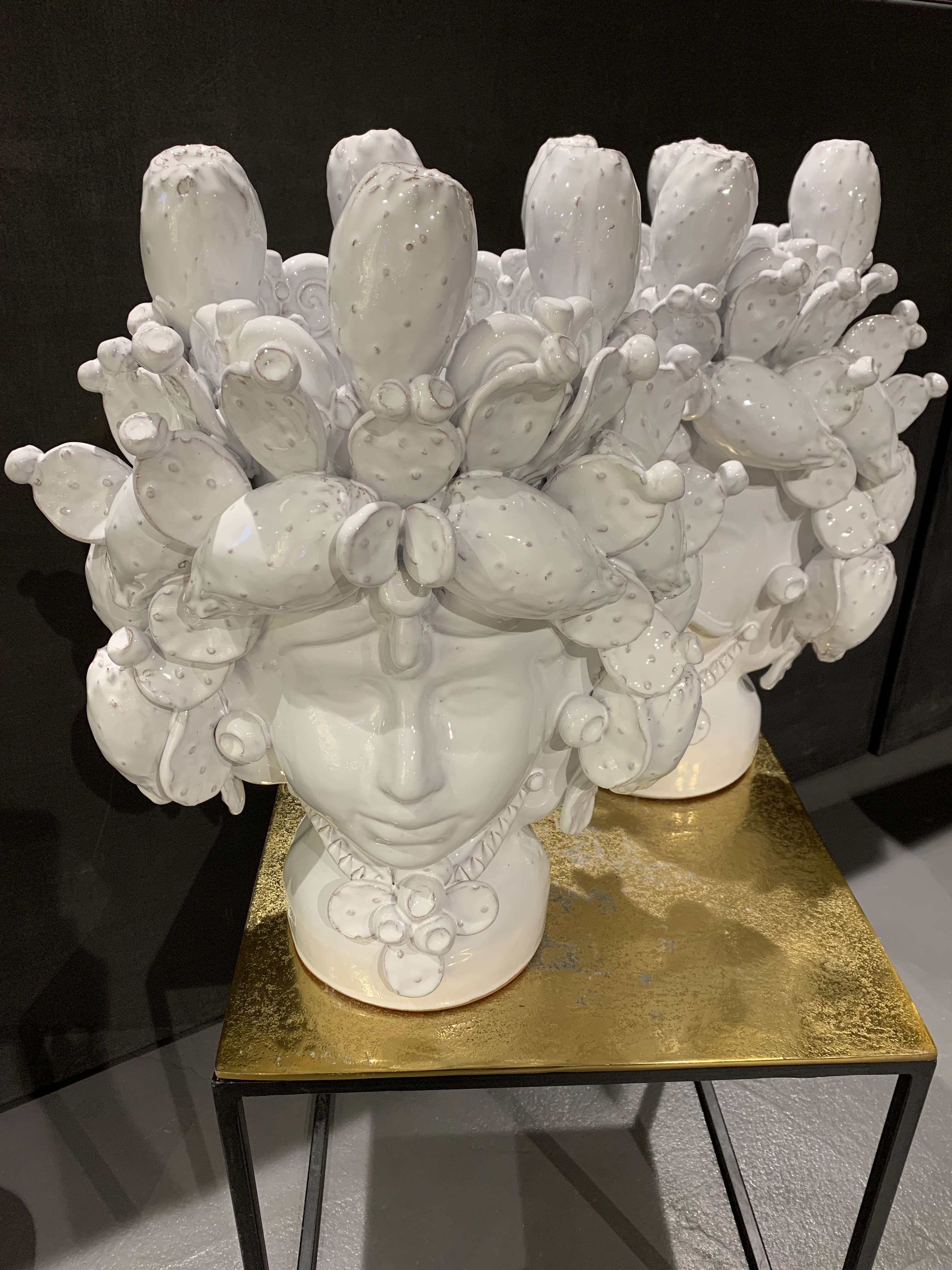 Coppia di teste di Moro in ceramica smaltata.