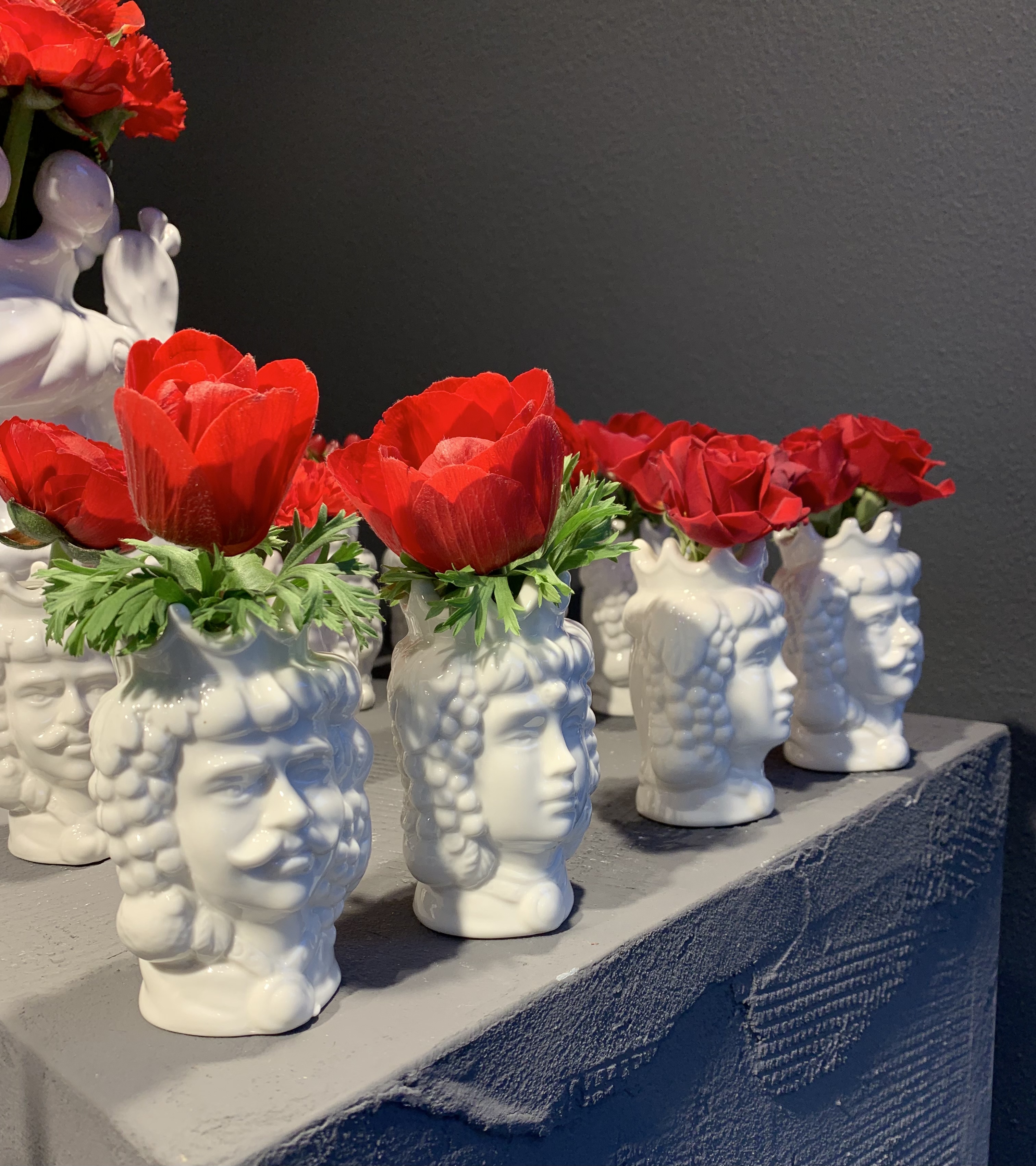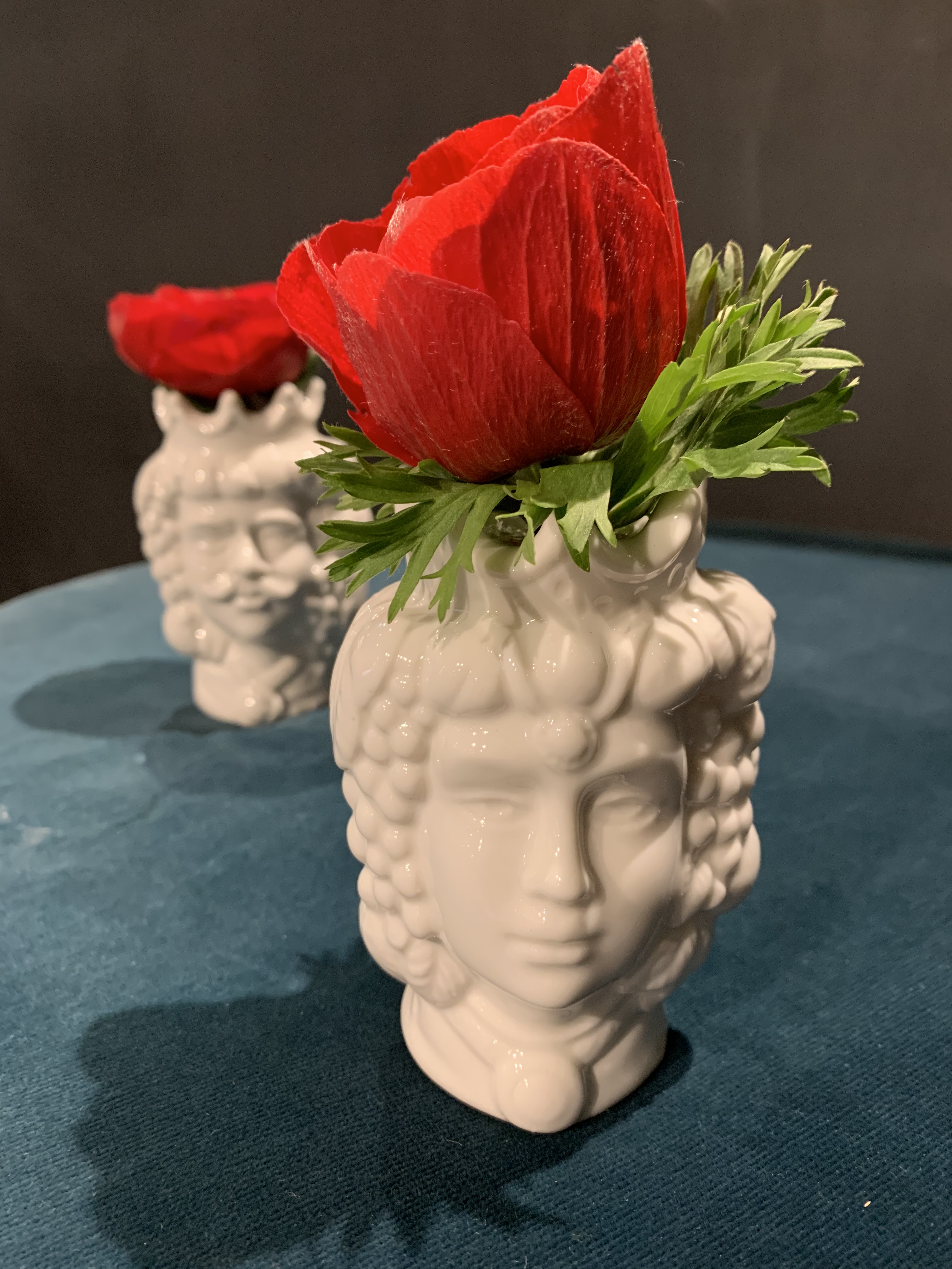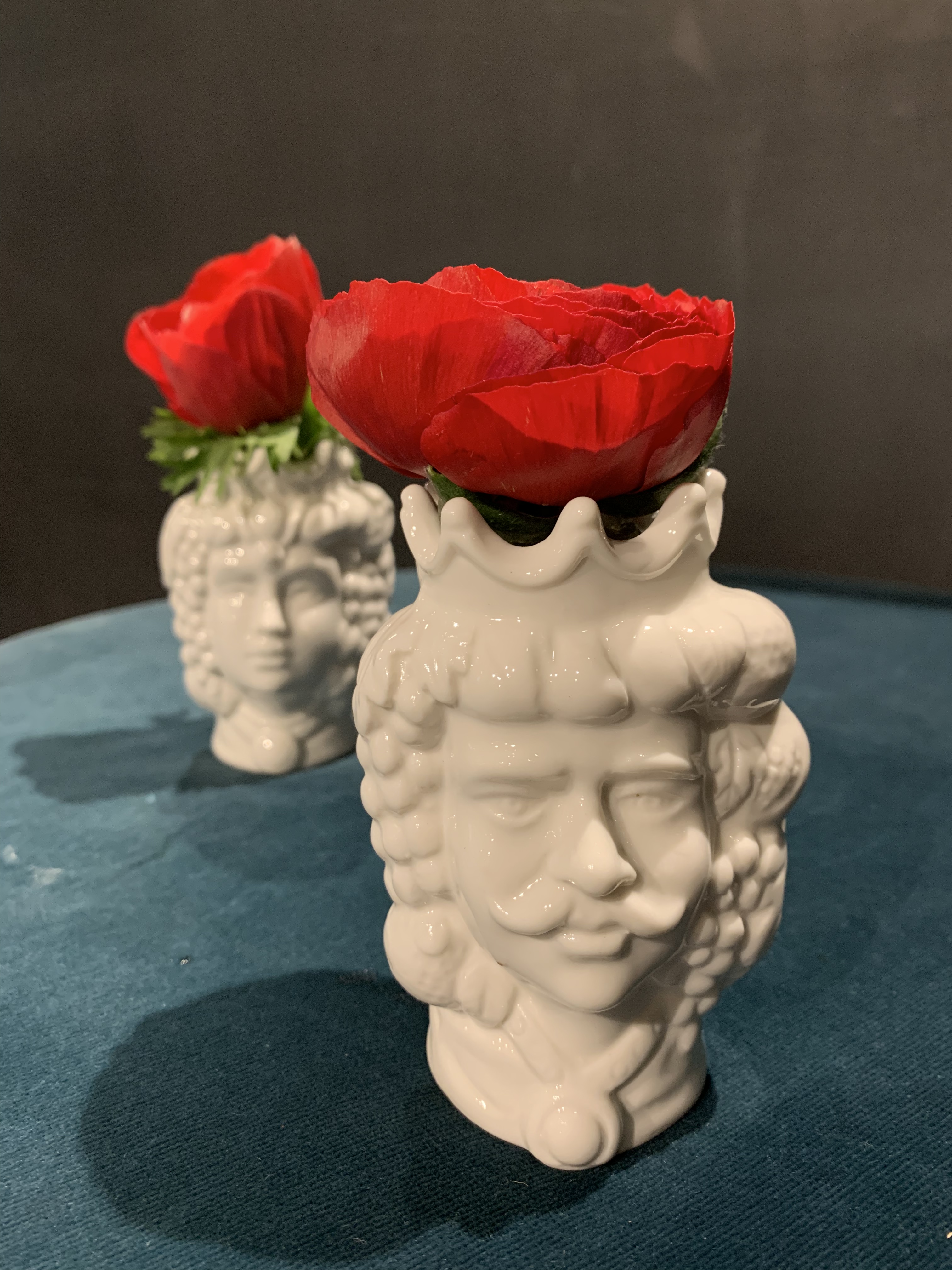 Coppia teste di moro in ceramica con piccola ampolla dove poter posizionare un fiore o una fragranza. (Viene venduto con bastoncini in midollino naturale compresi nel prezzo; fragranza e fiore sono esclusi.)