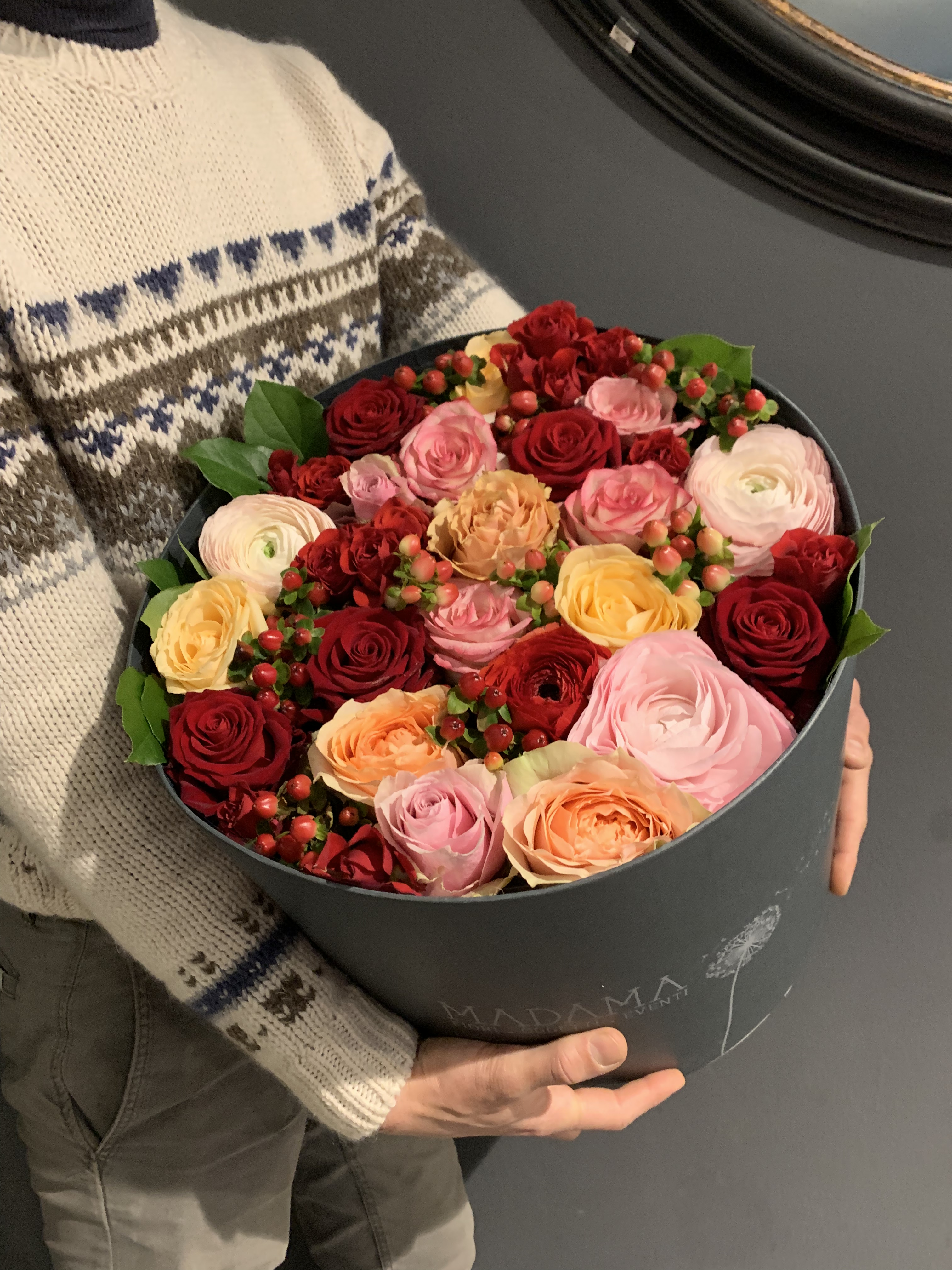 Flower box con fiori freschi dalle tonalità rosa e rosse. La scelta del fiore dipende dalla stagionalità e dalla disponibilità.