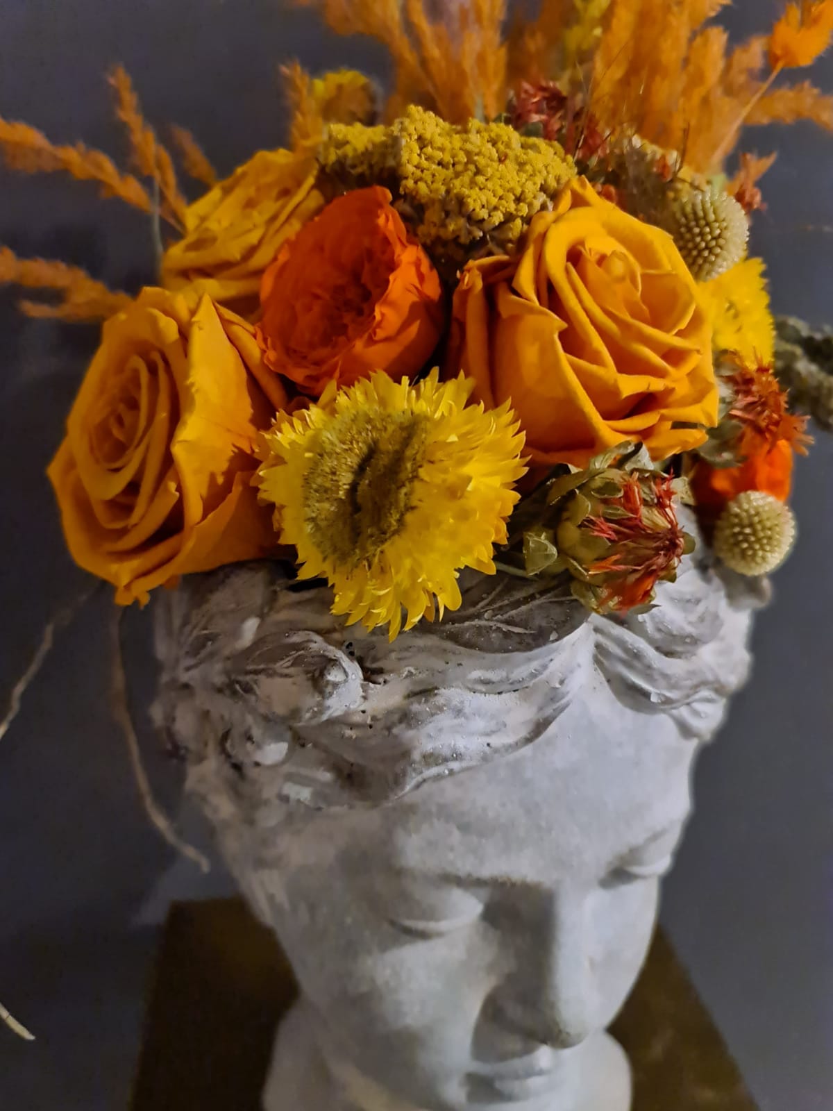 Testa grandezza naturale, decorata con elementi secchi e stabilizzati a lunga durata.