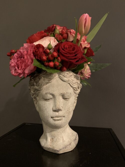 Vaso testa in cemento con fiori dalle tonalità rosa.