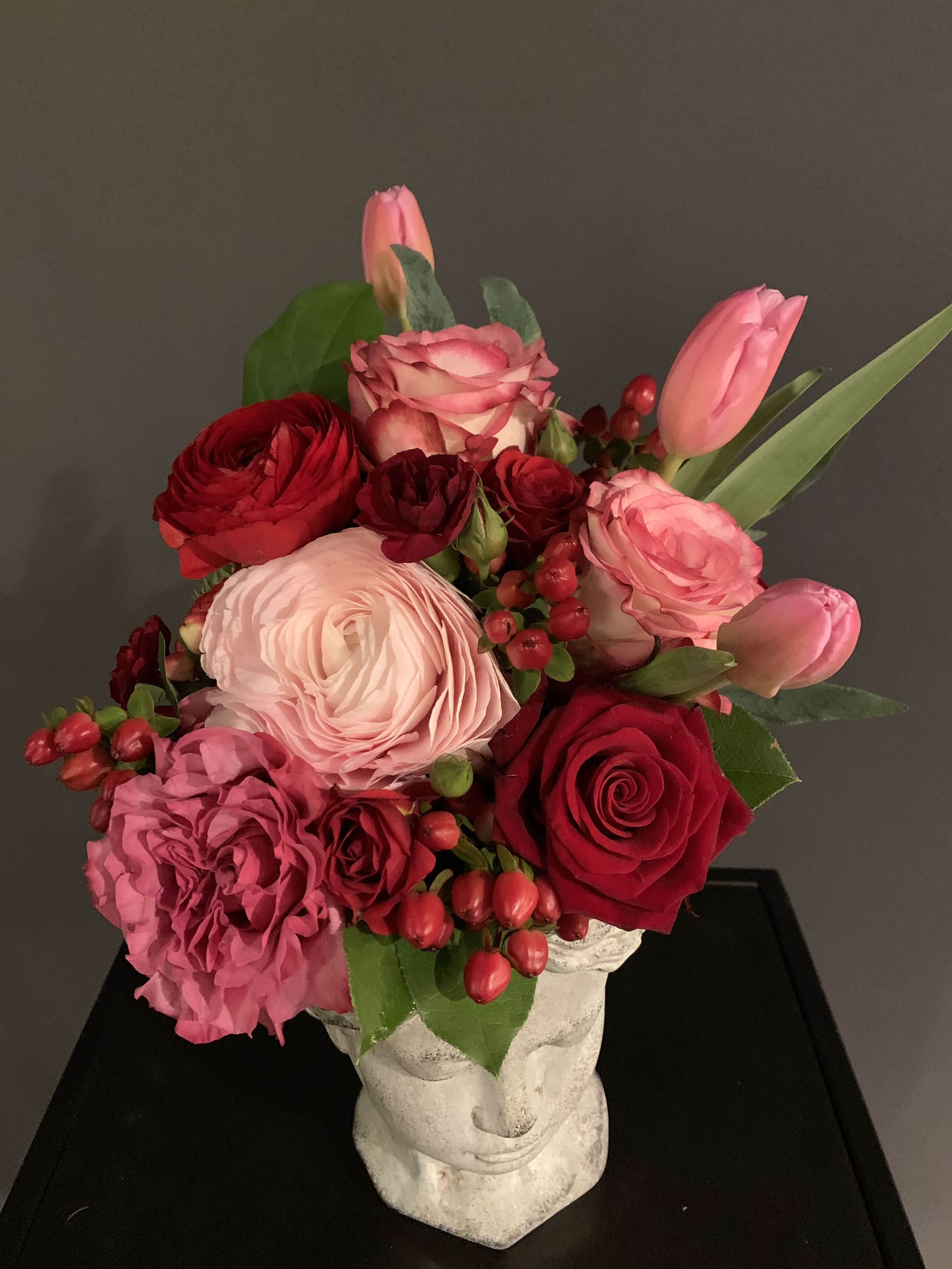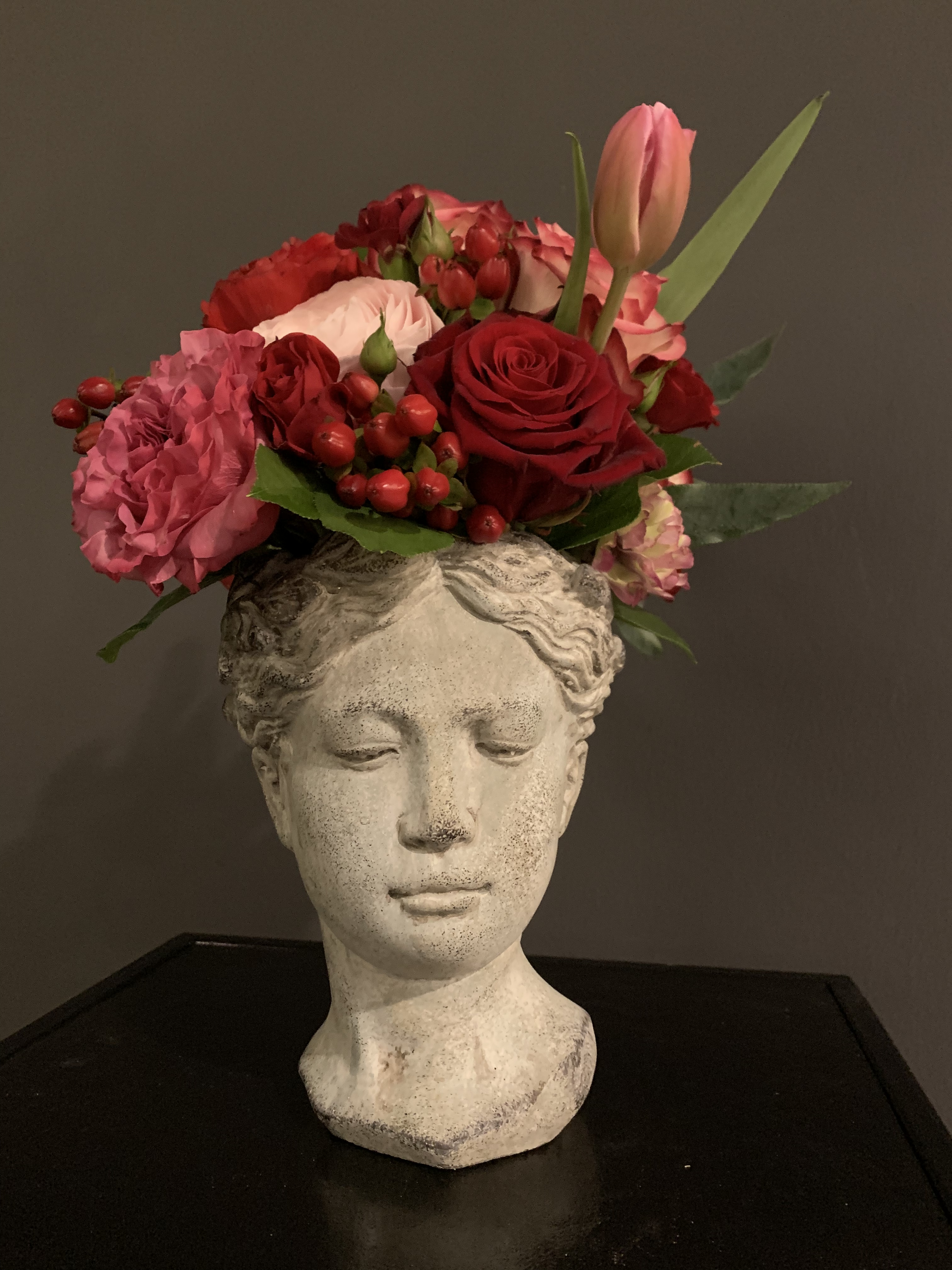 Vaso testa in cemento, Altezza 25cm, con fiori freschi. I fiori variano secondo stagionalità e disponibilità. Specifica nelle note le tue preferenze di colori e tonalità dei fiori.