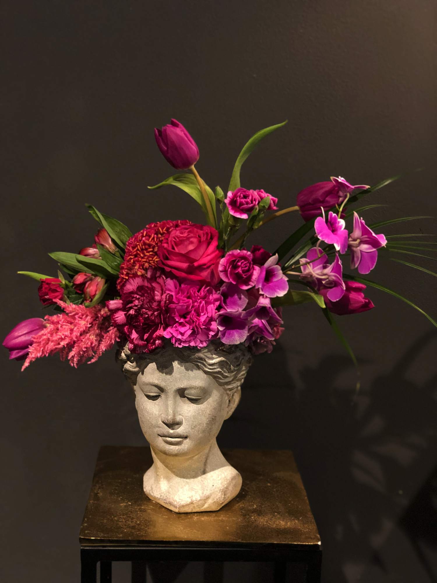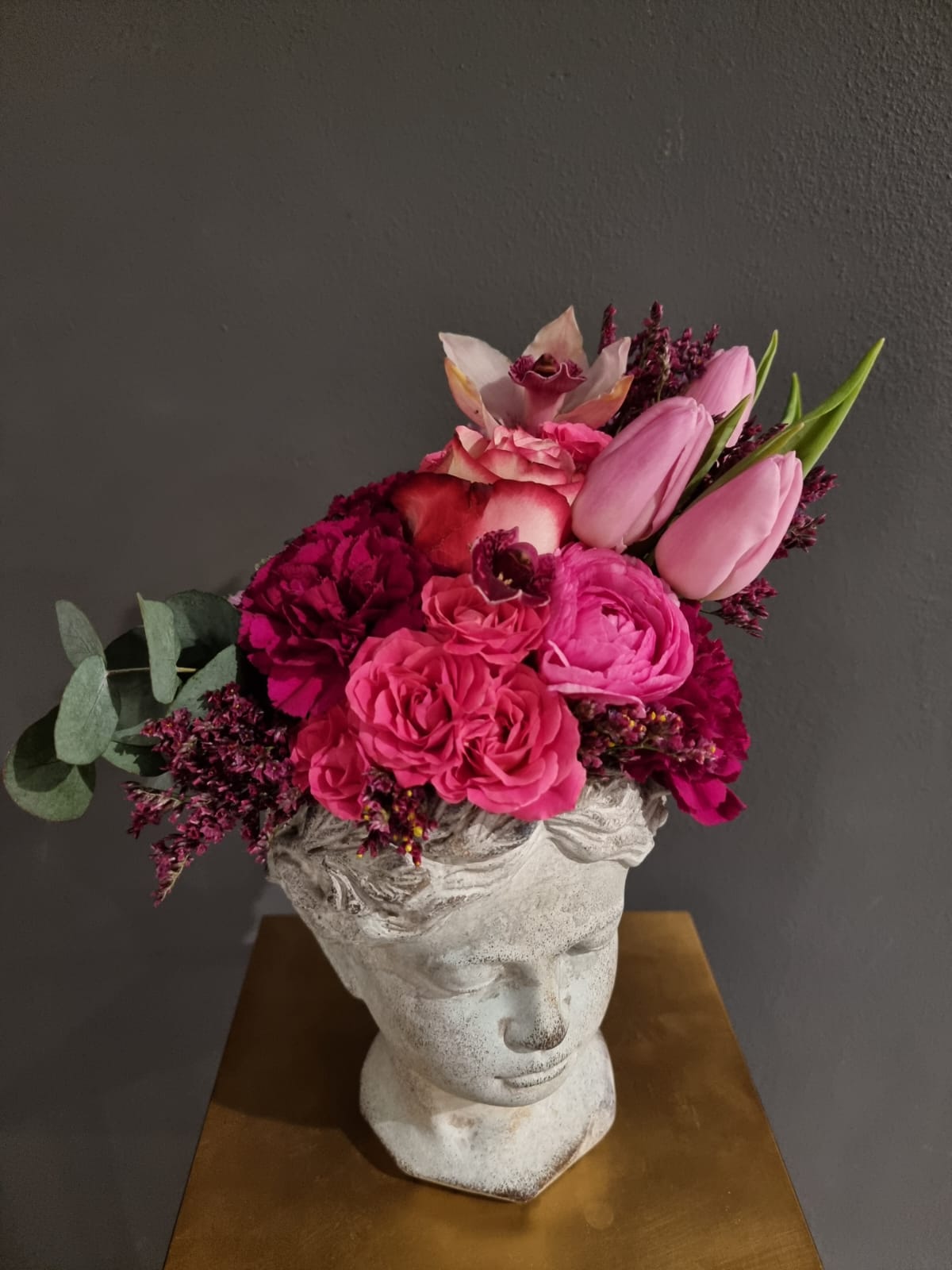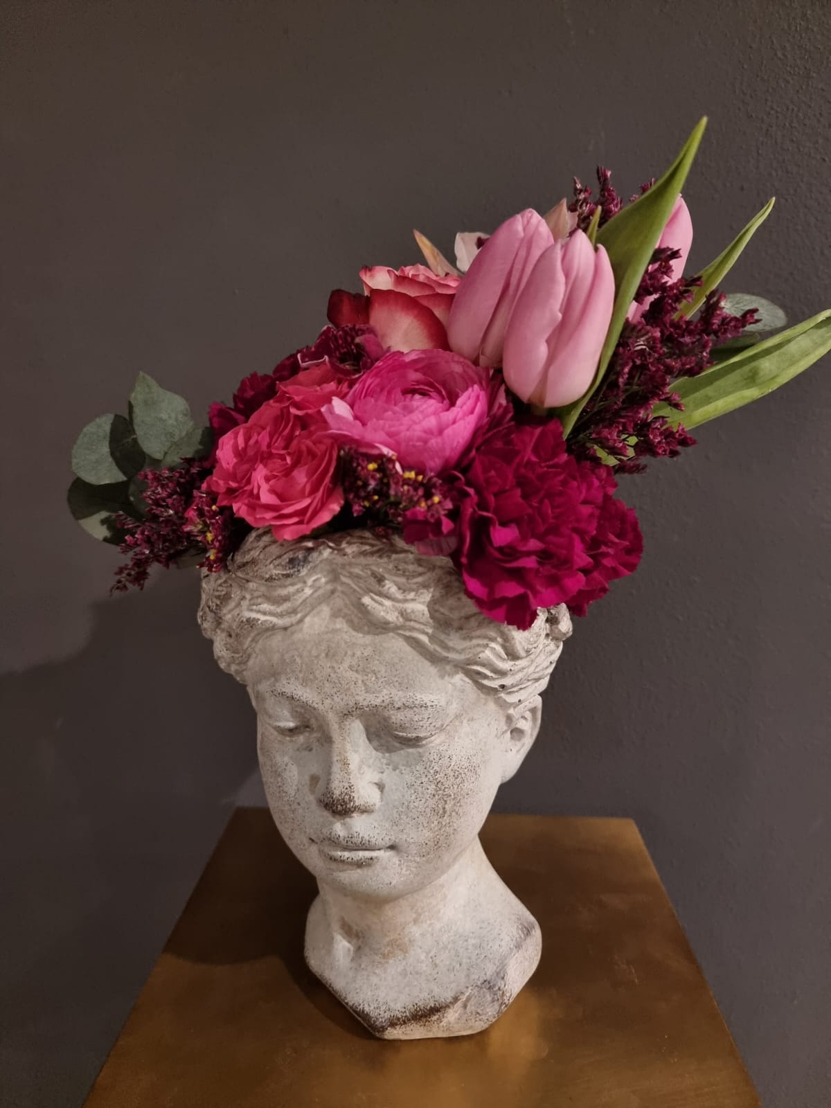Vaso testa in cemento, Altezza 20 cm, con fiori freschi. I fiori variano secondo stagionalità e disponibilità.