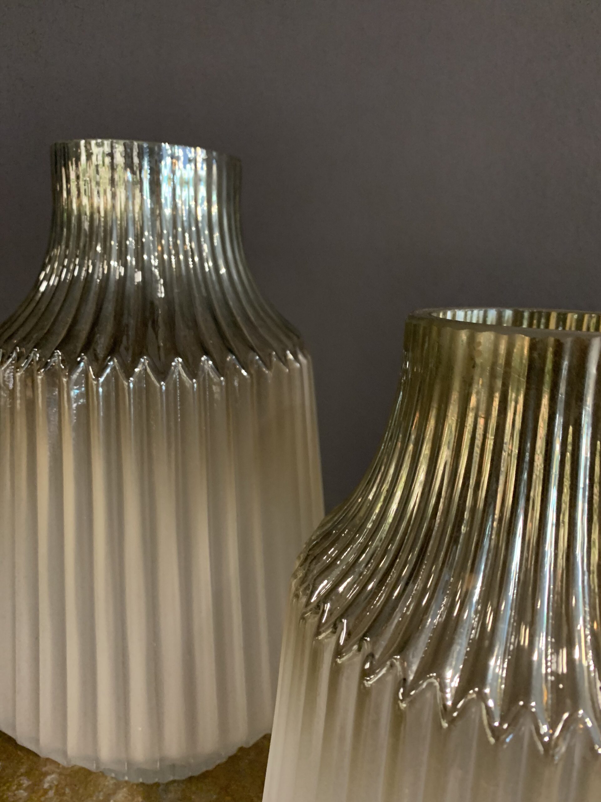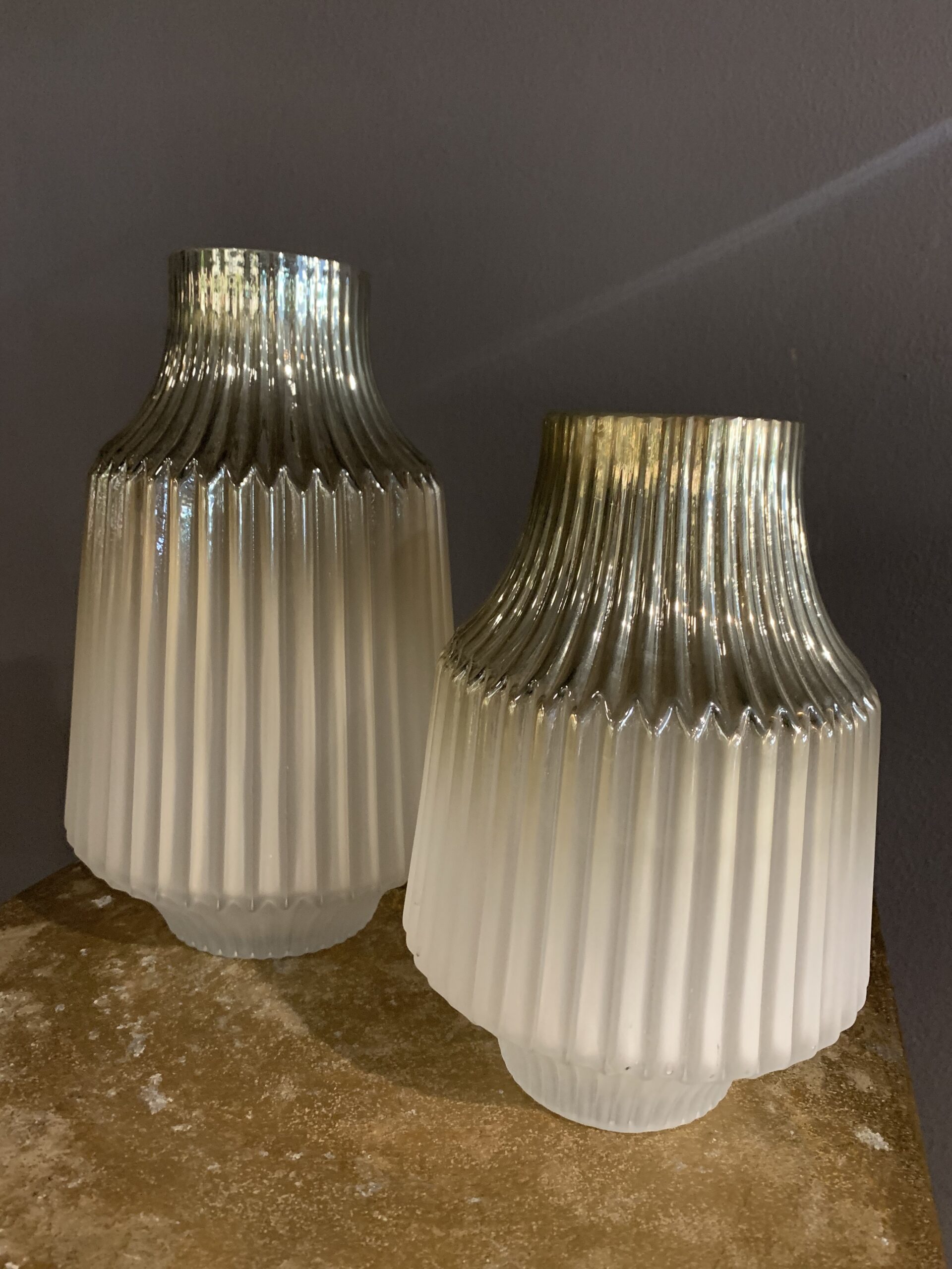 Vaso color bianco opaco e argento chiaro, in vetro con motivi strutturati.