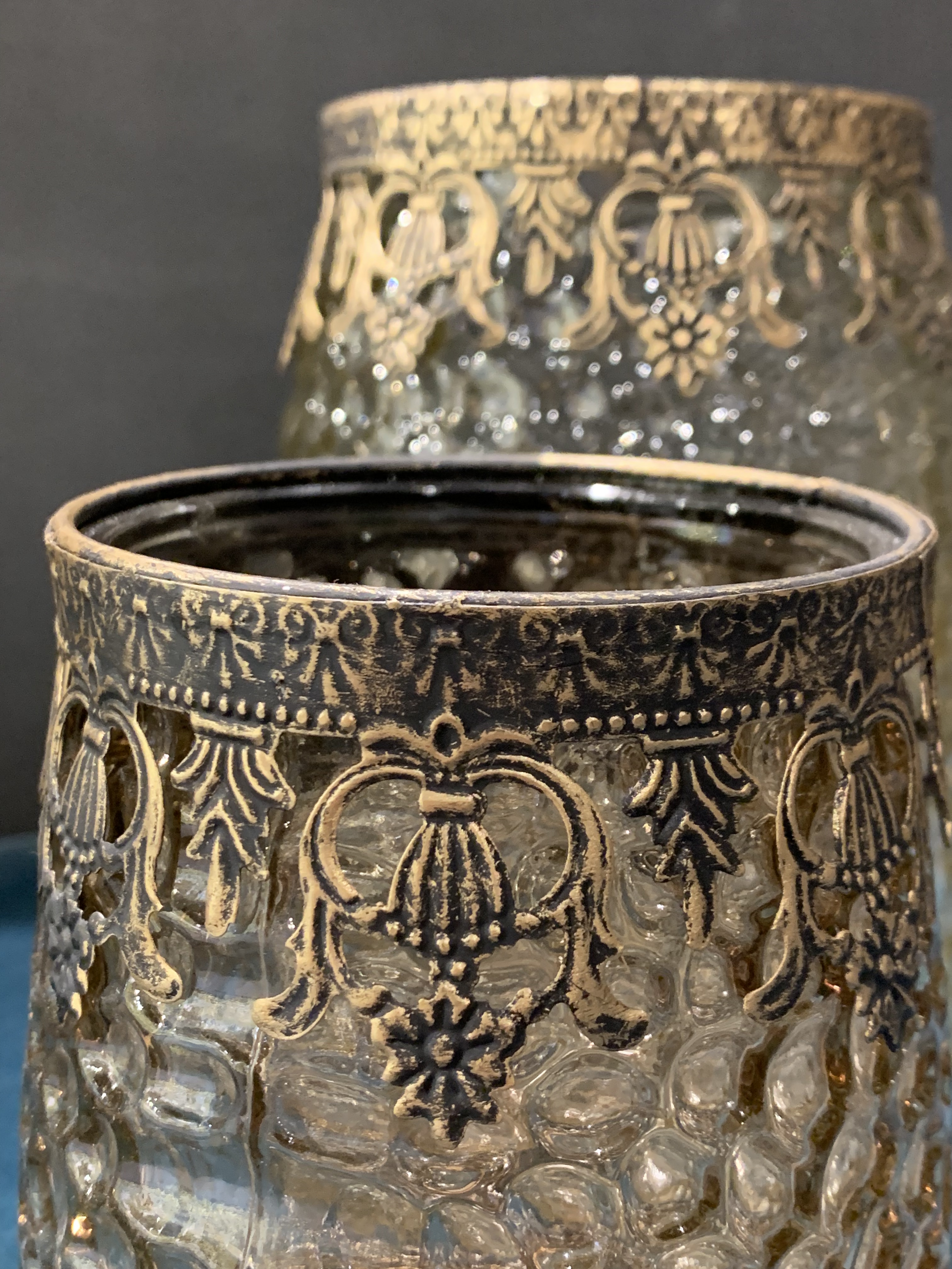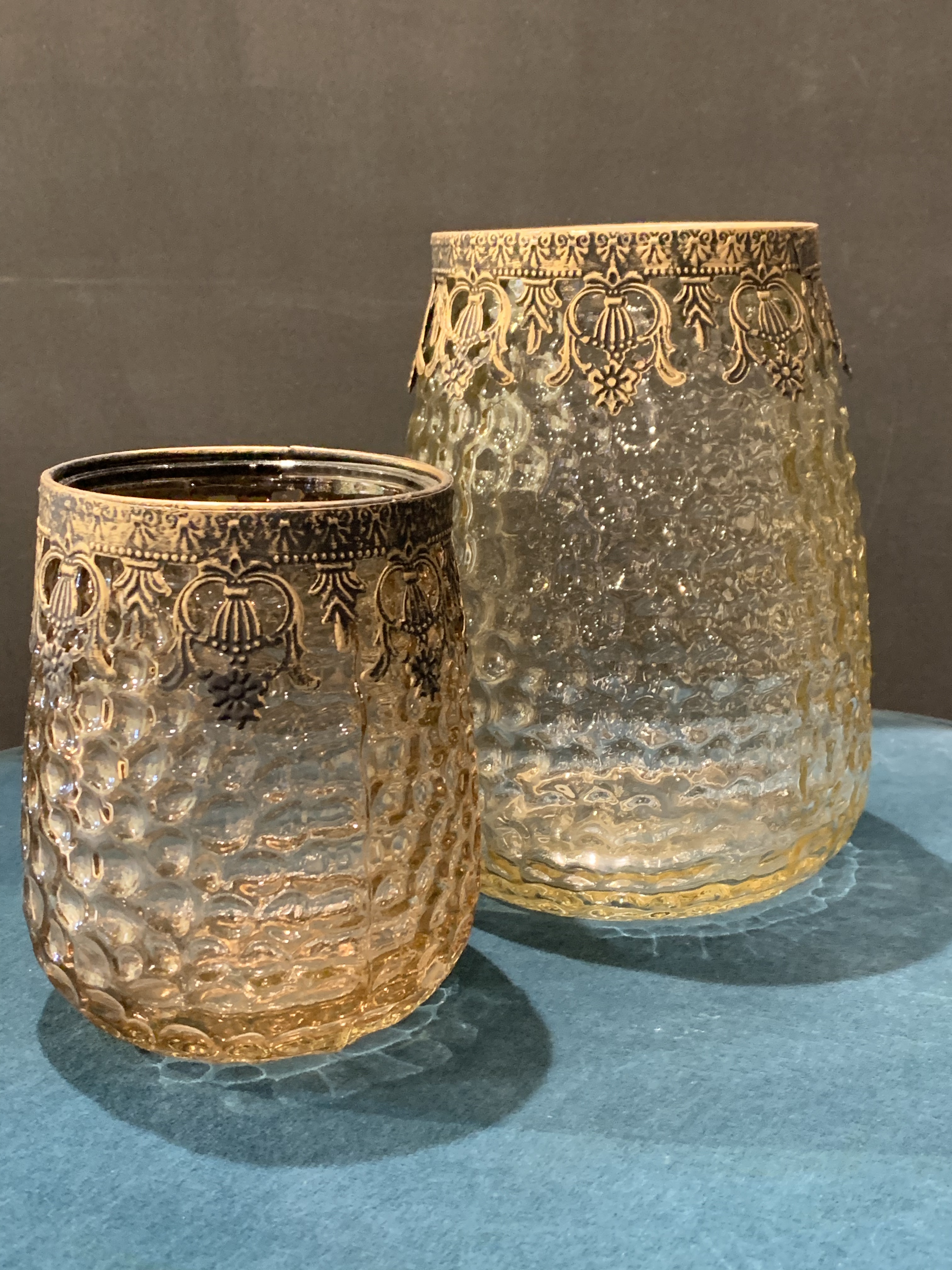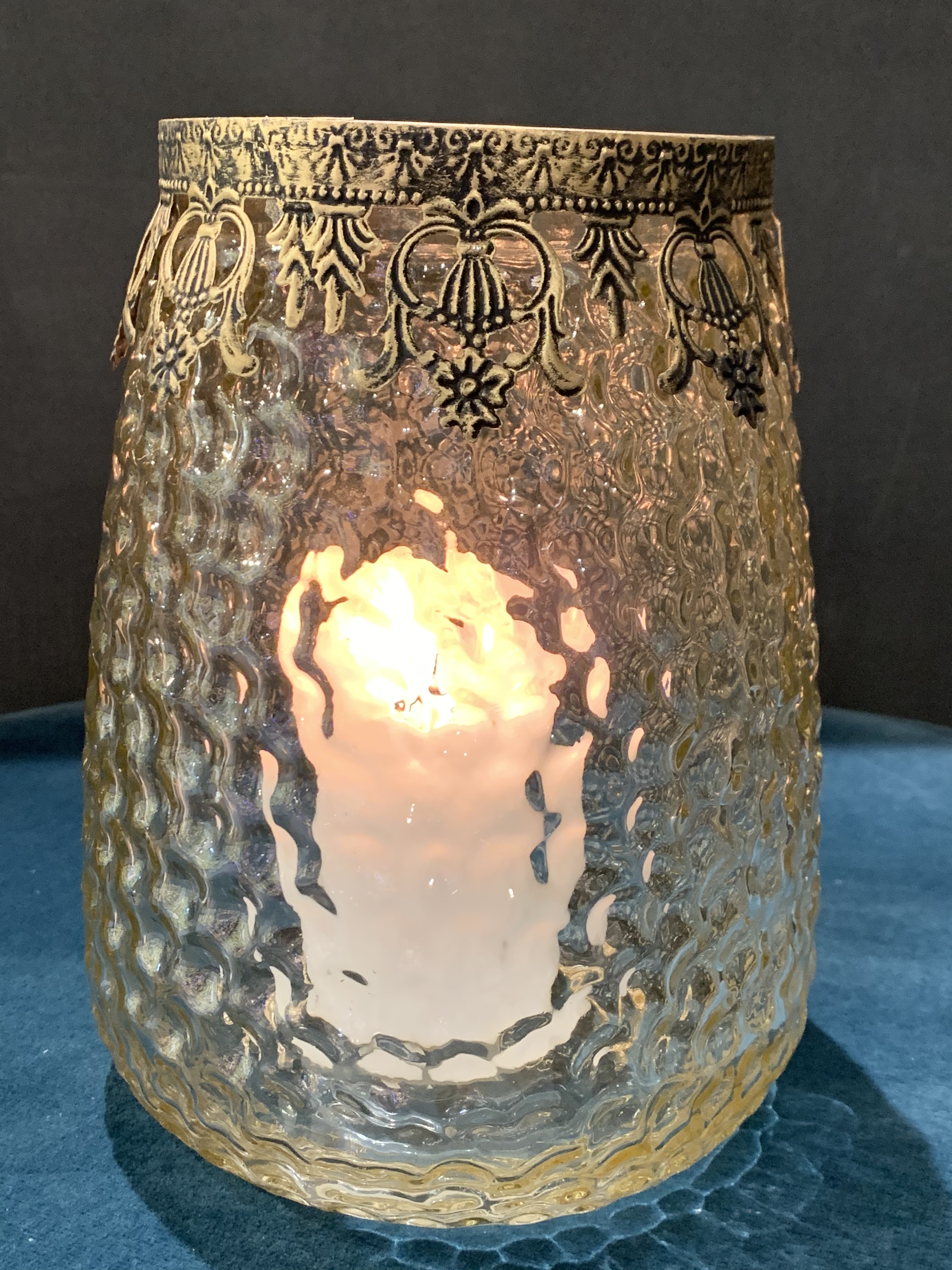 Vaso lanterna in vetro molato e rifiniture in metallo